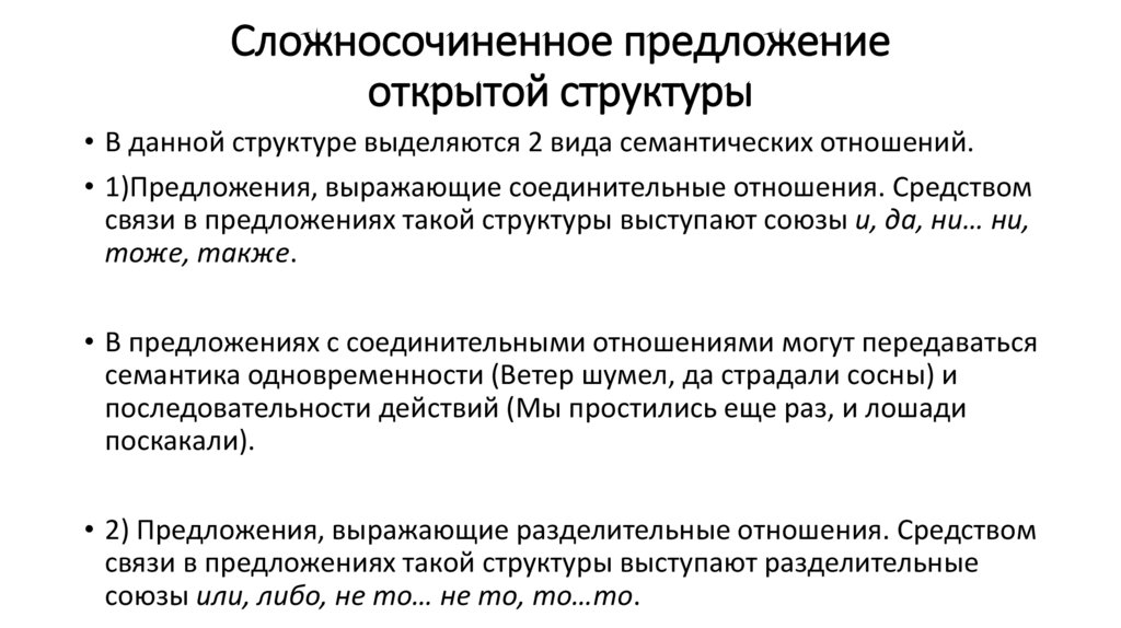 • С точки зрения структуры выделяют:• 1)сложносочиненные предложения открытой структуры, где