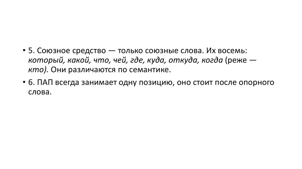 • 5. Союзное средство — только союзные слова. Их восемь:который, какой, что, чей, где, куда, откуда, когда (реже —