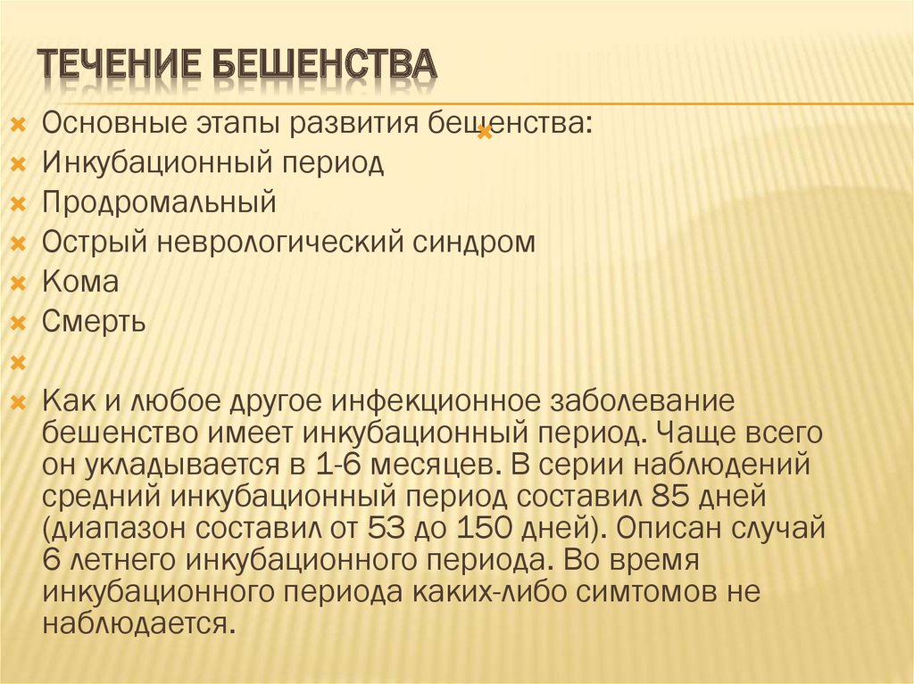 ТЕЧЕНИЕ БЕШЕНСТВАОсновные этапы развития бешенства: