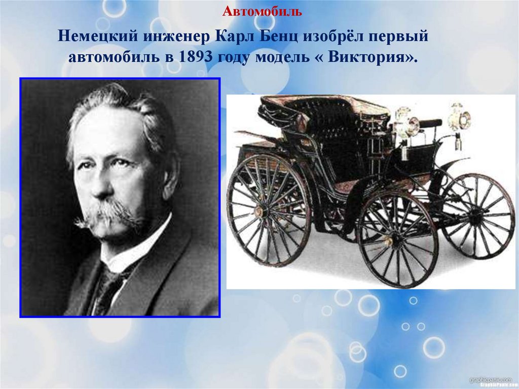АвтомобильНемецкий инженер Карл Бенц изобрёл первый