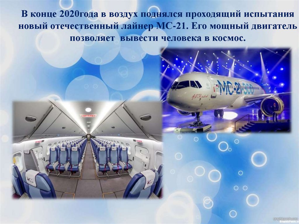 В конце 2020года в воздух поднялся проходящий испытанияновый отечественный лайнер МС-21. Его мощный двигатель