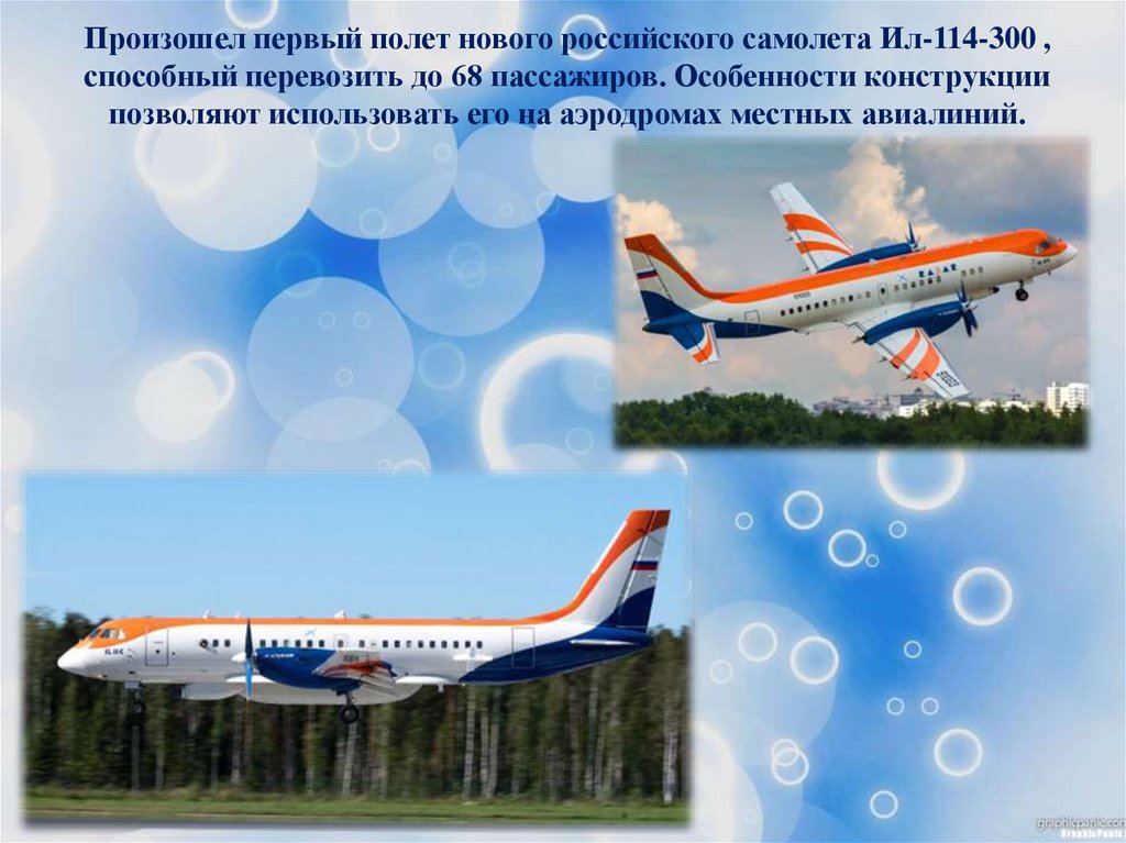 Произошел первый полет нового российского самолета Ил-114-300 ,способный перевозить до 68 пассажиров. Особенности конструкции