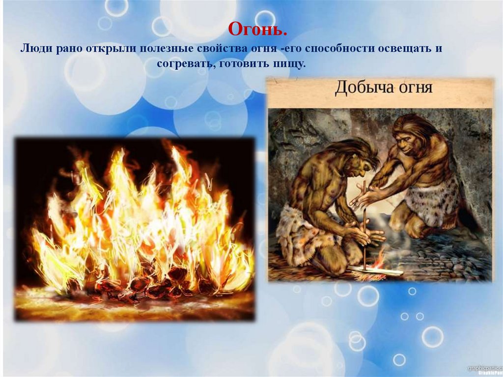 Огонь.Люди рано открыли полезные свойства огня -его способности освещать и