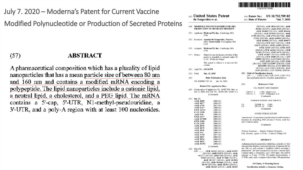 July 7. 2020 – Moderna’s Patent for Current VaccineModified Polynucleotide or Production of Secreted Proteins