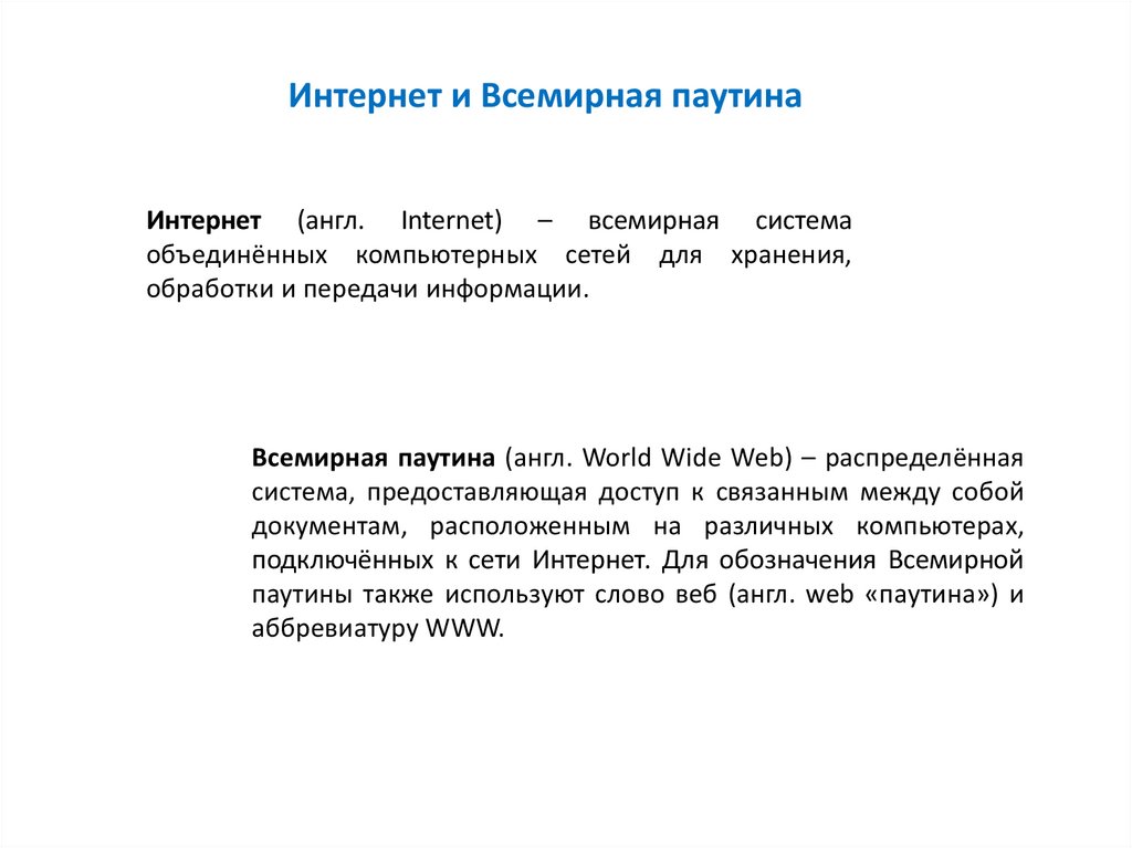 Интернет и Всемирная паутинаИнтернет (англ. Internet) – всемирная система