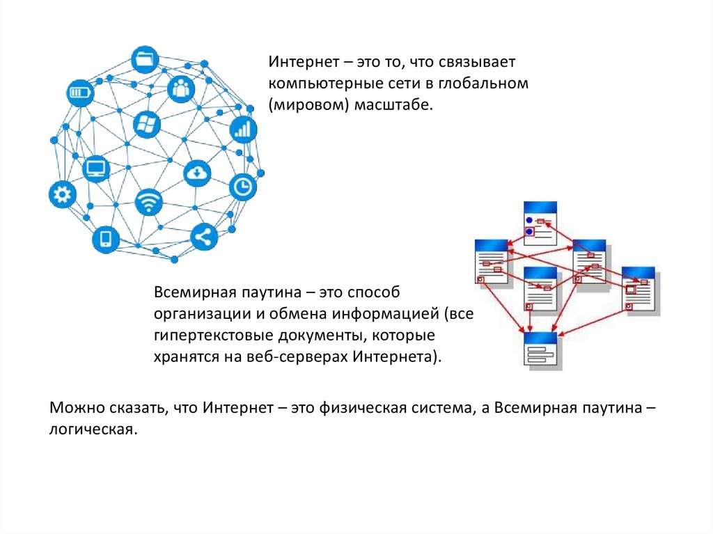 Можно сказать, что Интернет – это физическая система, а Всемирная паутина –