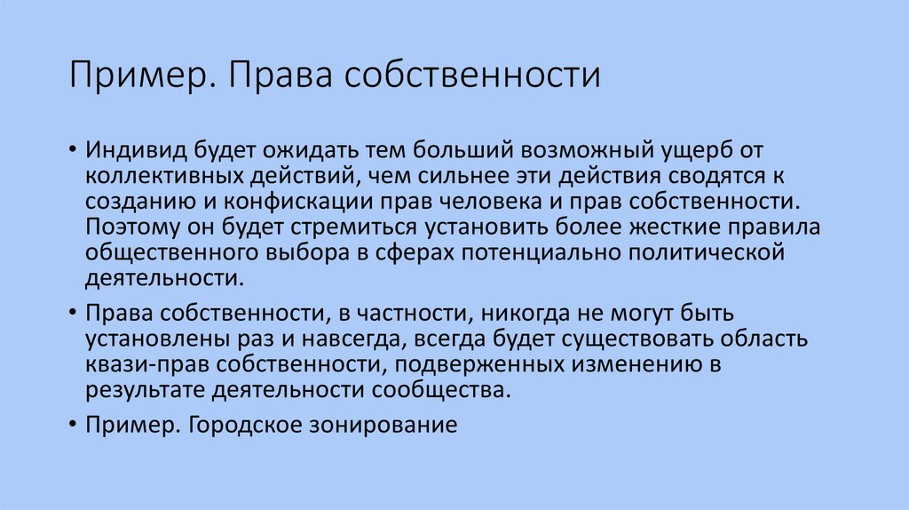 Пример. Права собственности• Индивид будет ожидать тем больший возможный ущерб от