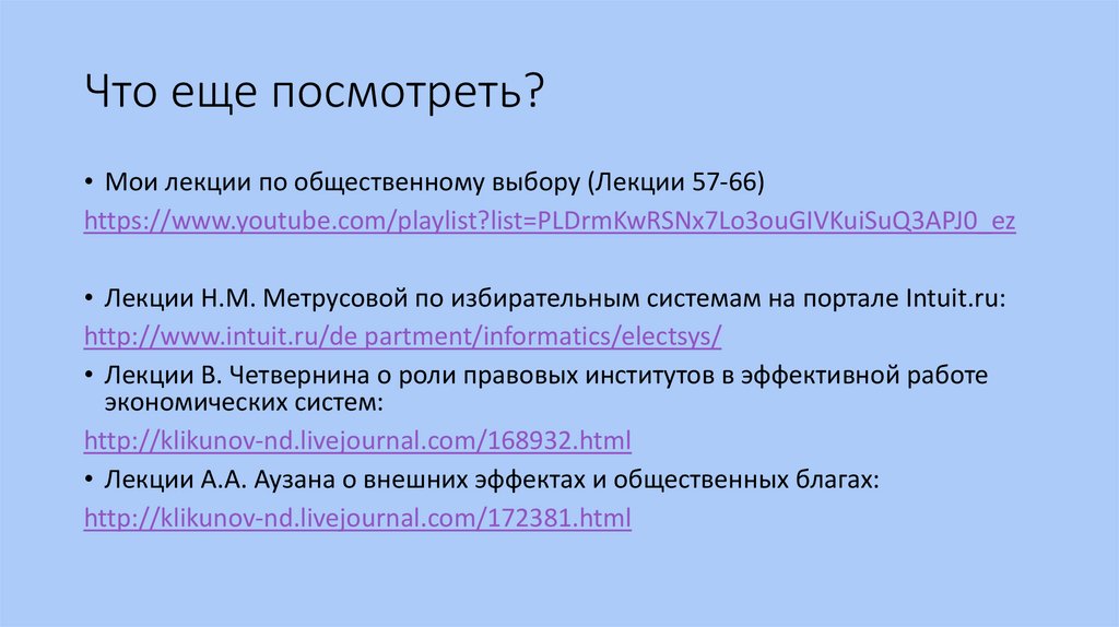 Что еще посмотреть?• Мои лекции по общественному выбору (Лекции 57-66)