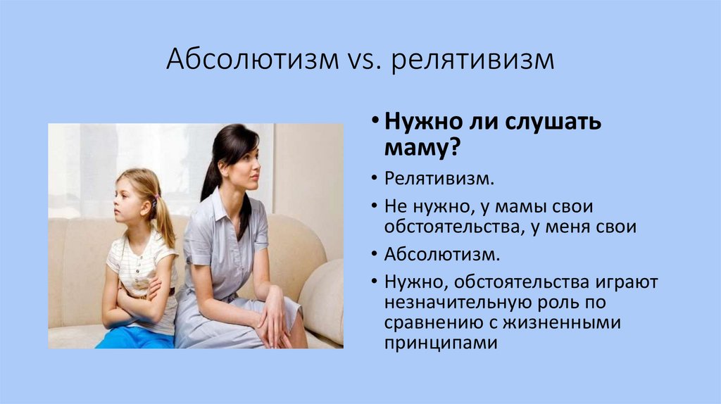 Абсолютизм vs. релятивизм• Нужно ли слушать
