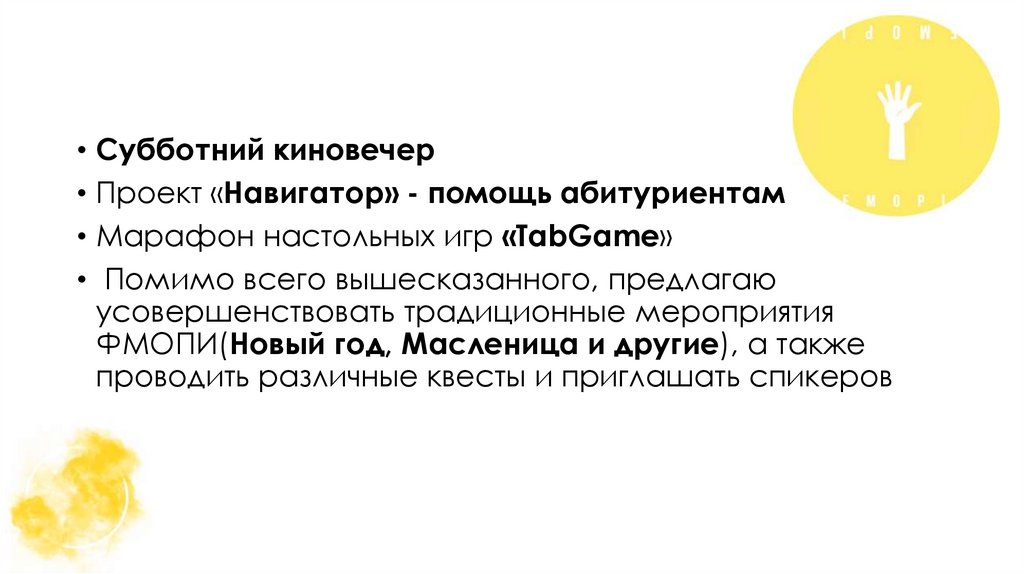 • Субботний киновечер• Проект «Навигатор» - помощь абитуриентам