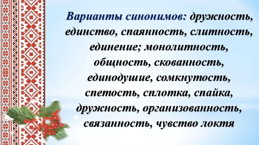 Варианты синонимов: дружность,единство, спаянность, слитность,