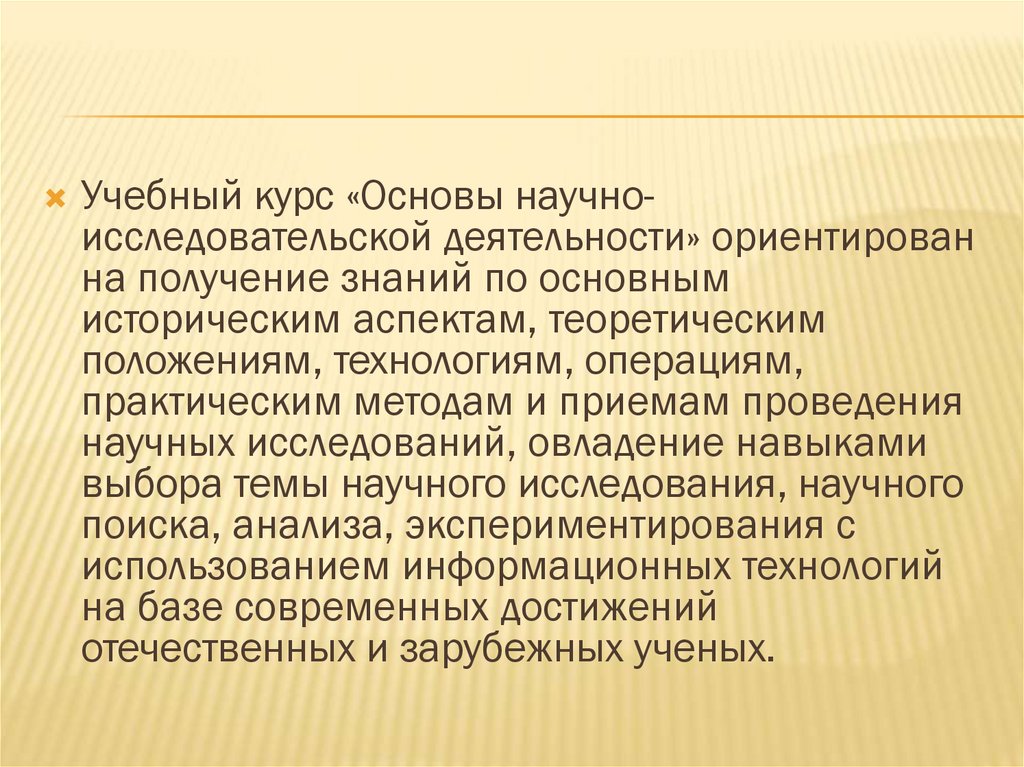 Учебный курс «Основы научноисследовательской деятельности» ориентированна получение знаний по основным