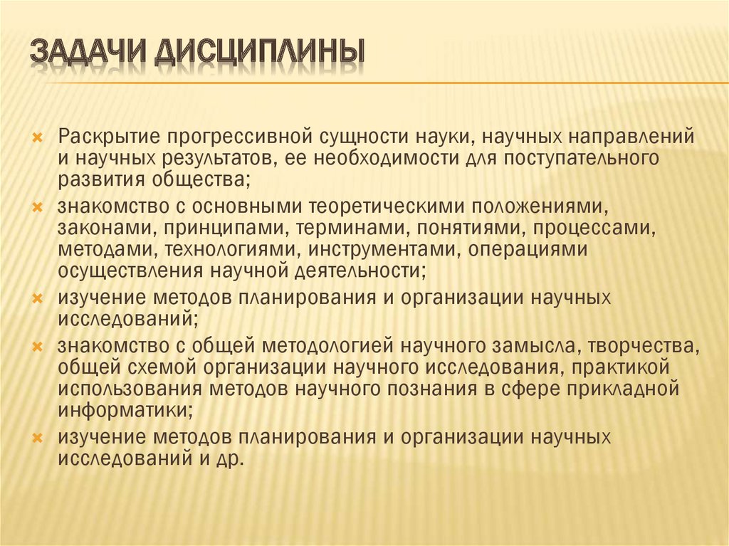 ЗАДАЧИ ДИСЦИПЛИНЫРаскрытие прогрессивной сущности науки, научных направлений