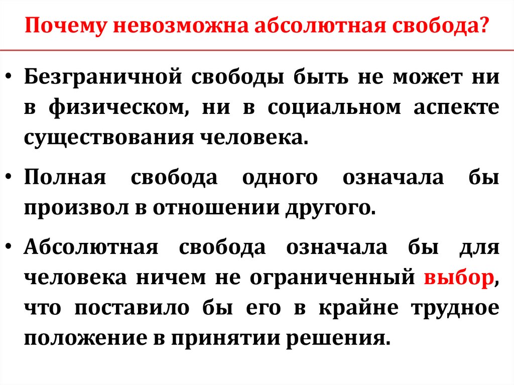 Почему невозможна абсолютная свобода?• Безграничной свободы быть не может ни