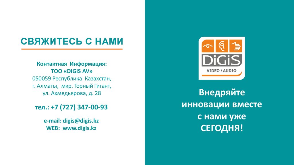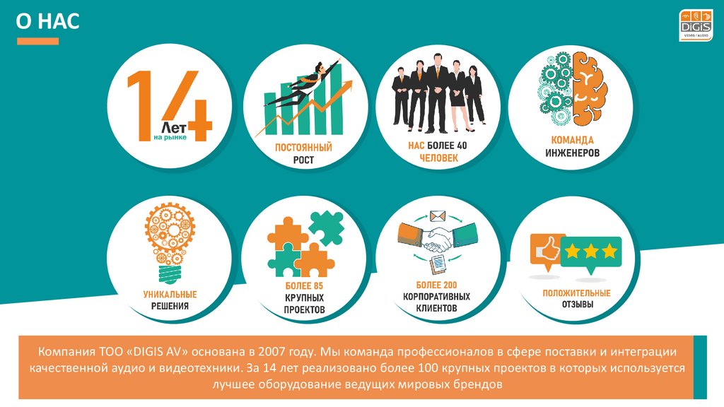 О НАСКомпания ТОО «DIGIS AV» основана в 2007 году. Мы команда профессионалов в сфере поставки и интеграции