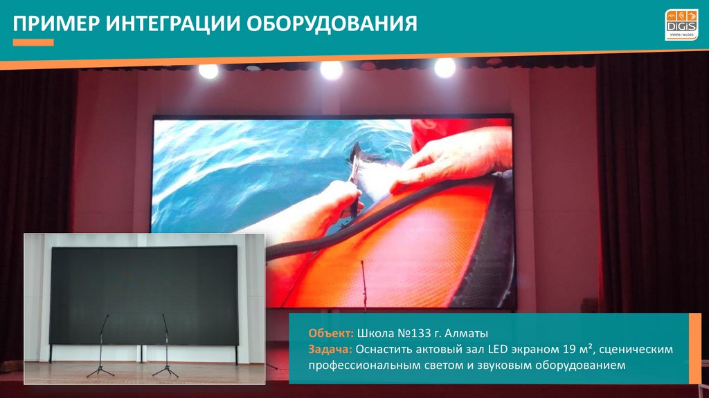 Задача: Оснастить актовый зал LED экраном 19 м², сценическим