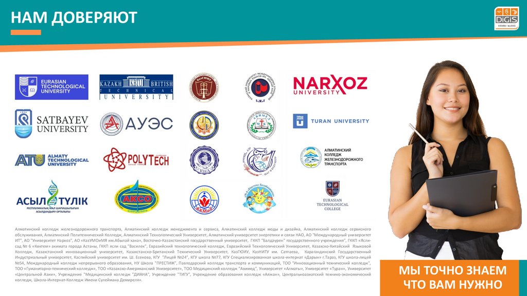 НАМ ДОВЕРЯЮТАлматинский колледж железнодорожного транспорта, Алматинский колледж менеджмента и сервиса, Алматинский колледж моды и дизайна, Алматинский колледж сервисного