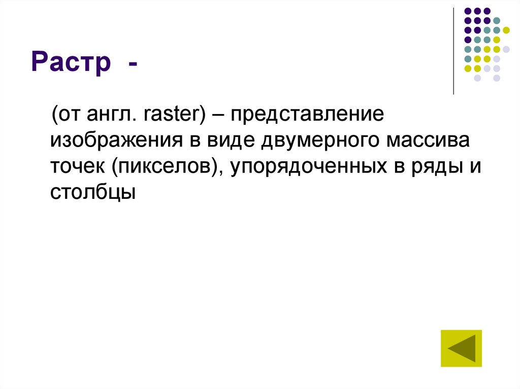 Растр (от англ. raster) – представлениеизображения в виде двумерного массива