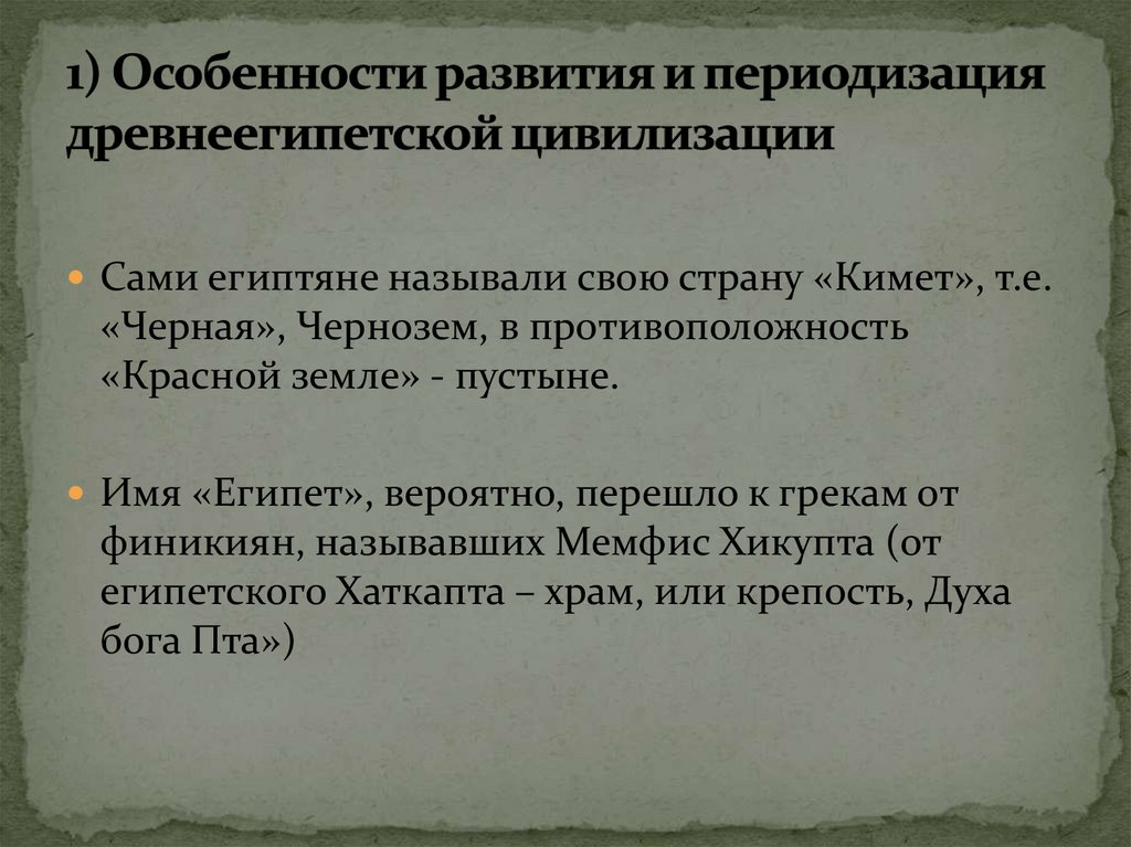 Сами египтяне называли свою страну «Кимет», т.е.«Черная», Чернозем, в противоположность