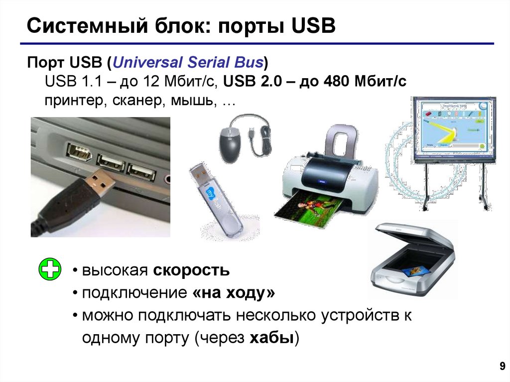 USB 1.1 – до 12 Мбит/c, USB 2.0 – до 480 Мбит/c