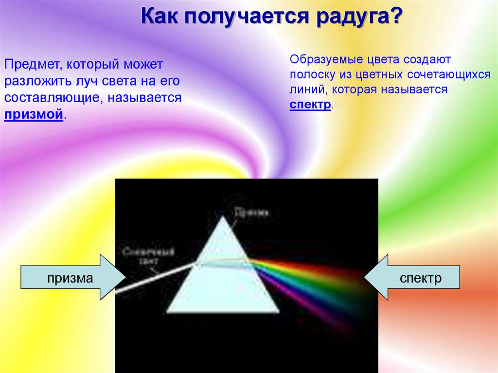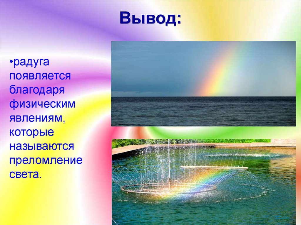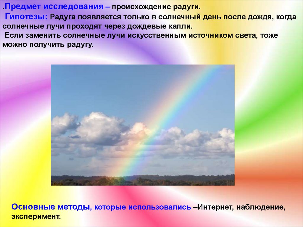.Предмет исследования – происхождение радуги.Гипотезы: Радуга появляется только в солнечный день после дождя, когда