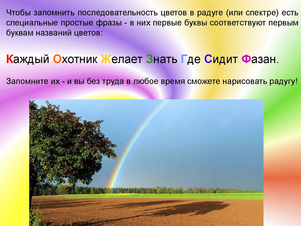 Чтобы запомнить последовательность цветов в радуге (или спектре) естьспециальные простые фразы - в них первые буквы соответствуют первым