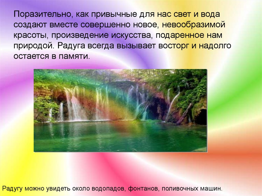 Радугу можно увидеть около водопадов, фонтанов, поливочных машин.