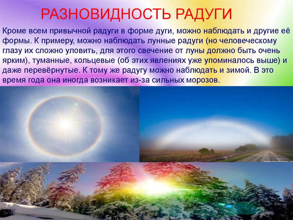 РАЗНОВИДНОСТЬ РАДУГИКроме всем привычной радуги в форме дуги, можно наблюдать и другие её