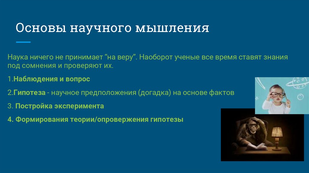 Основы научного мышленияНаука ничего не принимает “на веру”. Наоборот ученые все время ставят знания