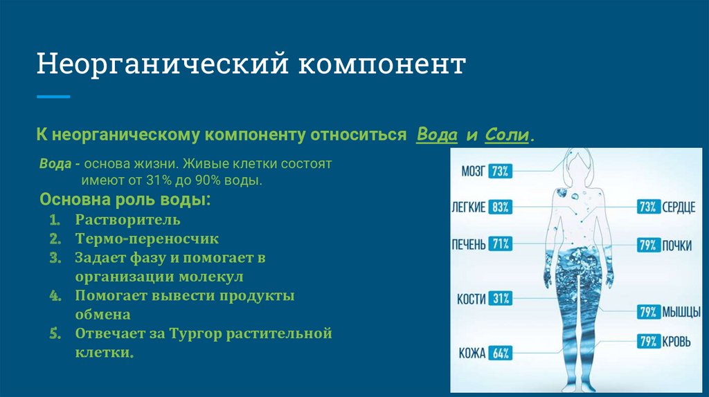 Неорганический компонентК неорганическому компоненту относиться Вода и Соли.