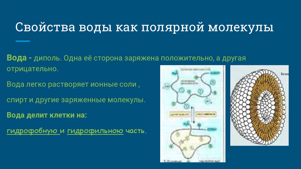Свойства воды как полярной молекулыВода - диполь. Одна её сторона заряжена положительно, а другая