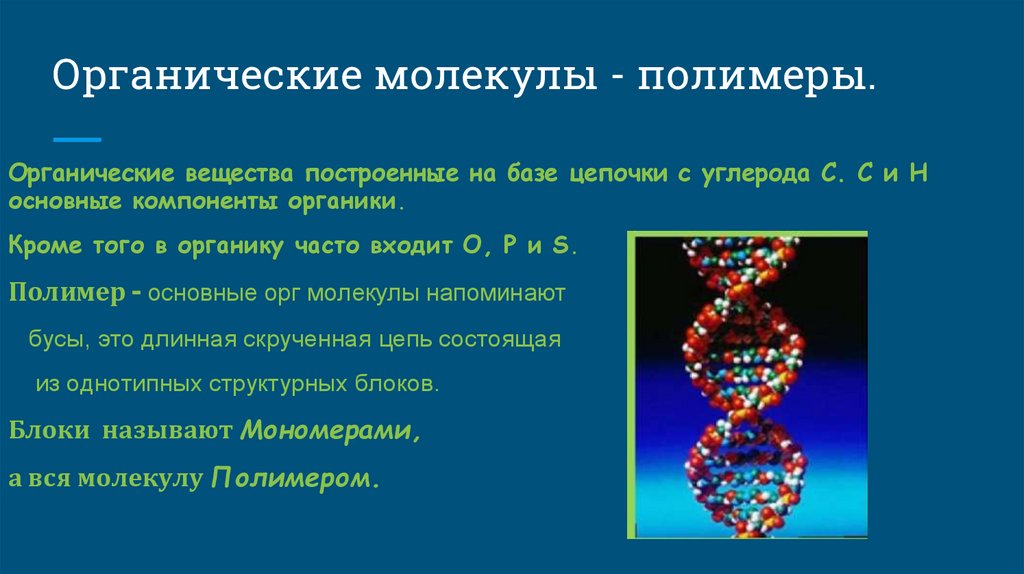 Органические молекулы - полимеры.Органические вещества построенные на базе цепочки с углерода С. С и Н
