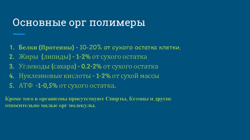 Основные орг полимеры1. Белки (Протеины) - 10-20% от сухого остатка клетки.