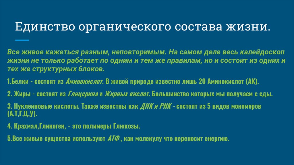 Единство органического состава жизни.Все живое кажеться разным, неповторимым. На самом деле весь калейдоскоп