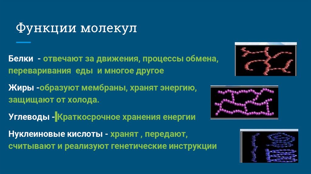 Функции молекулБелки - отвечают за движения, процессы обмена,