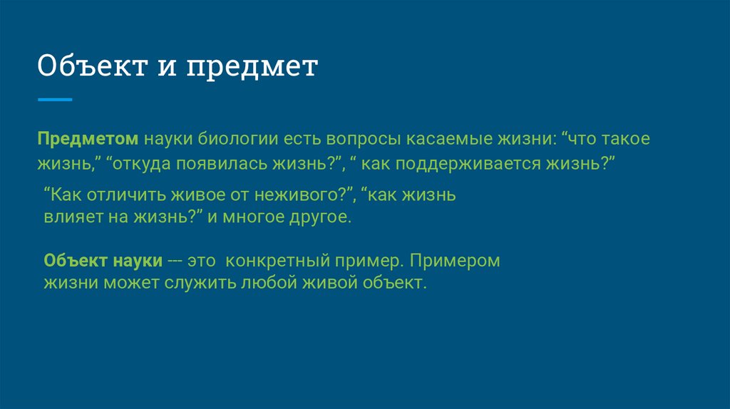 Объект и предметПредметом науки биологии есть вопросы касаемые жизни: “что такое