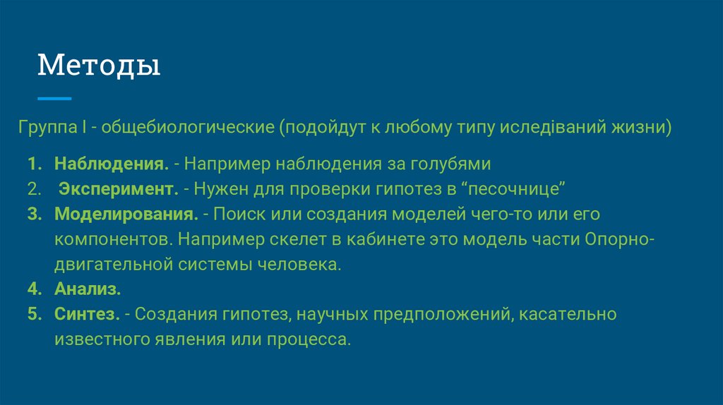 МетодыГруппа I - общебиологические (подойдут к любому типу иследіваний жизни)