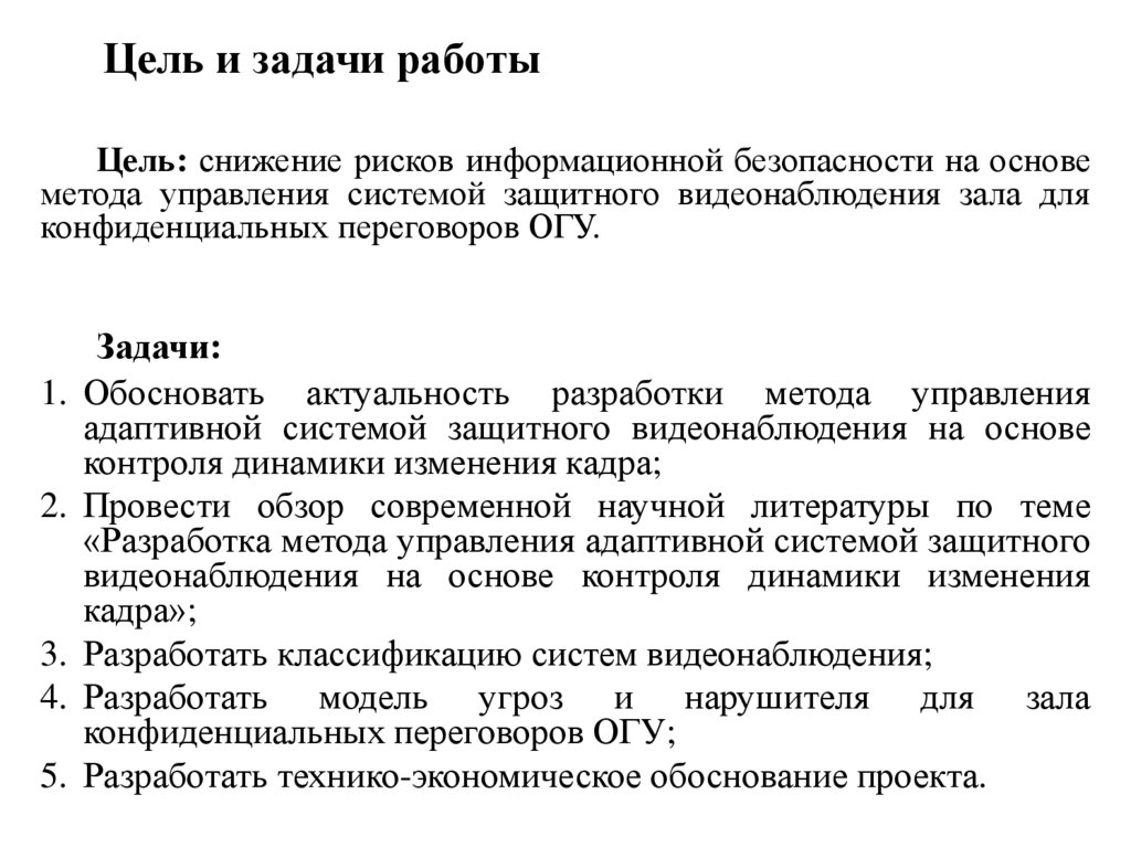 Задача 1. Обосновать актуальность разработки метода управленияадаптивной системой защитного видеонаблюдения на основе контроля