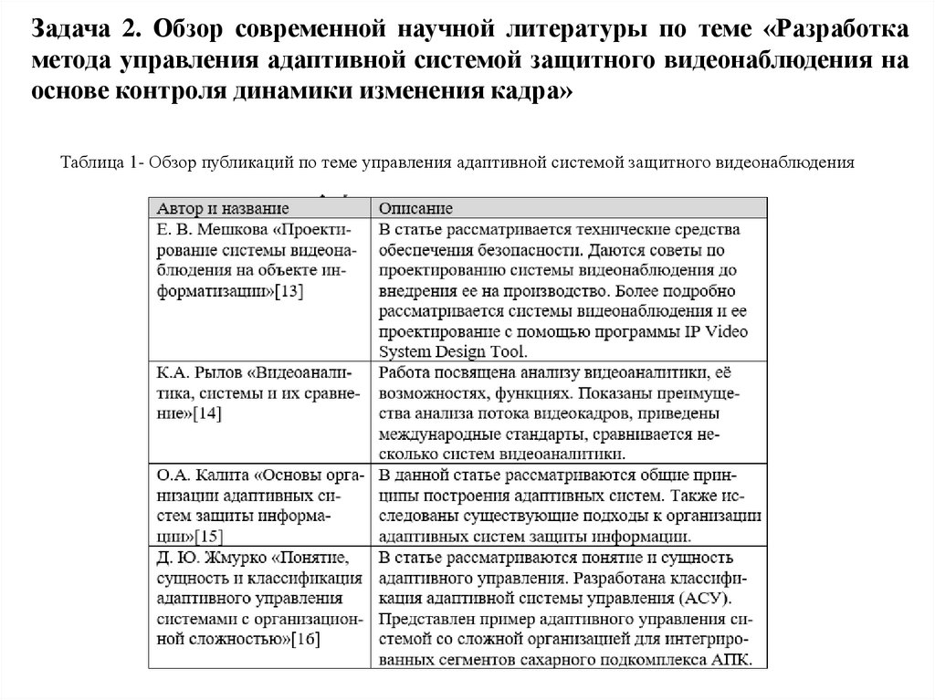 Задача 2. Обзор современной научной литературы по теме «Разработкаметода управления адаптивной системой защитного видеонаблюдения на