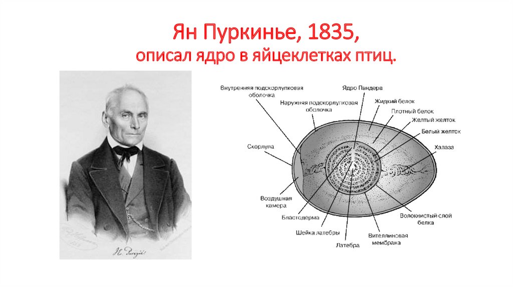 Ян Пуркинье, 1835,описал ядро в яйцеклетках птиц.