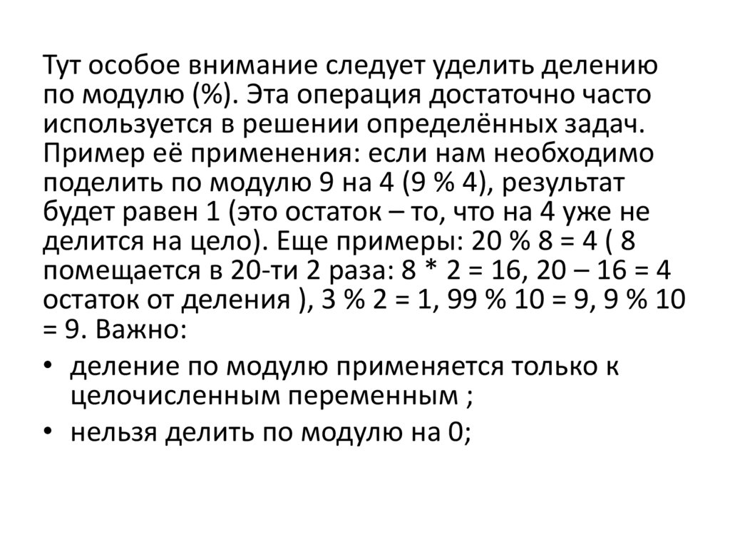 Тут особое внимание следует уделить делениюпо модулю (%). Эта операция достаточно часто