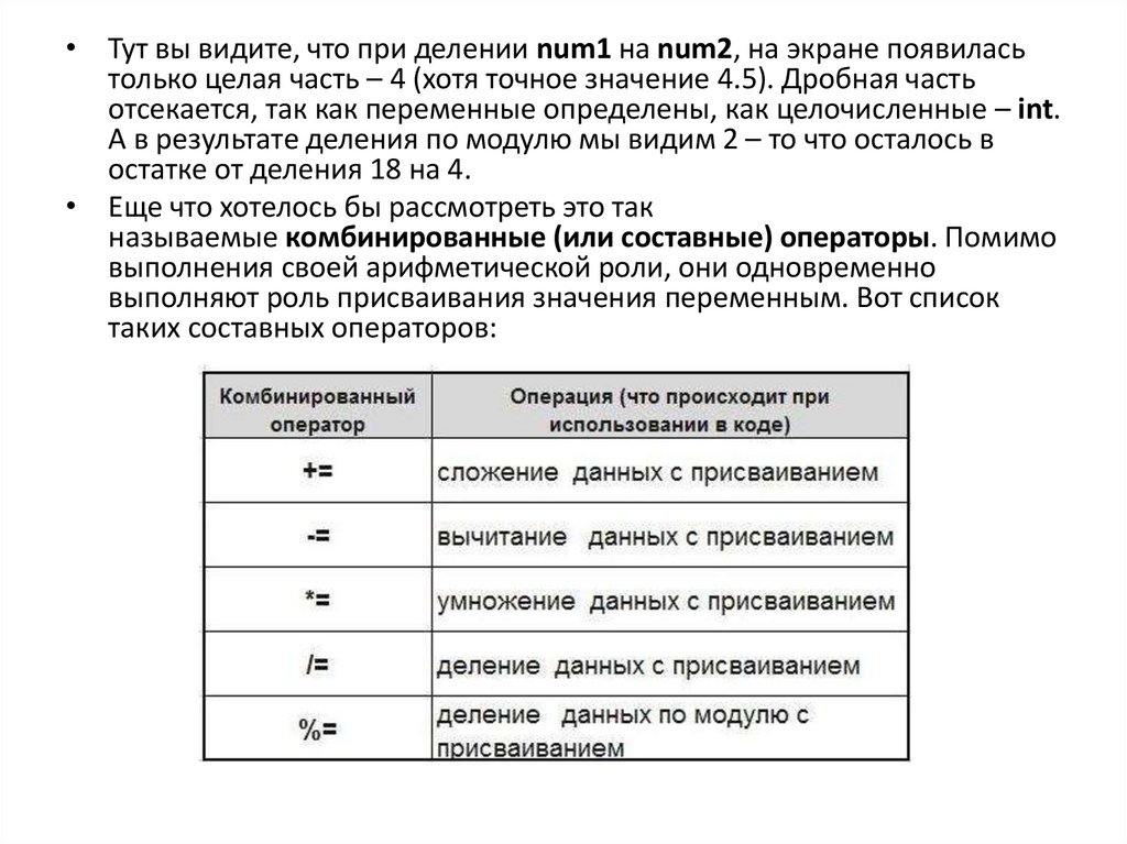 • Тут вы видите, что при делении num1 на num2, на экране появиласьтолько целая часть – 4 (хотя точное значение 4.5). Дробная часть