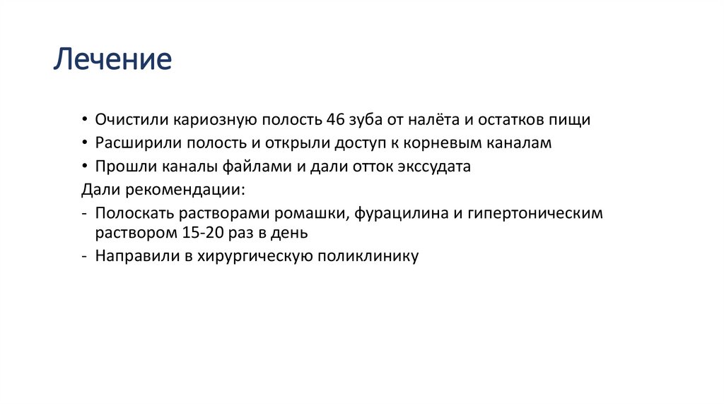Лечение• Очистили кариозную полость 46 зуба от налёта и остатков пищи