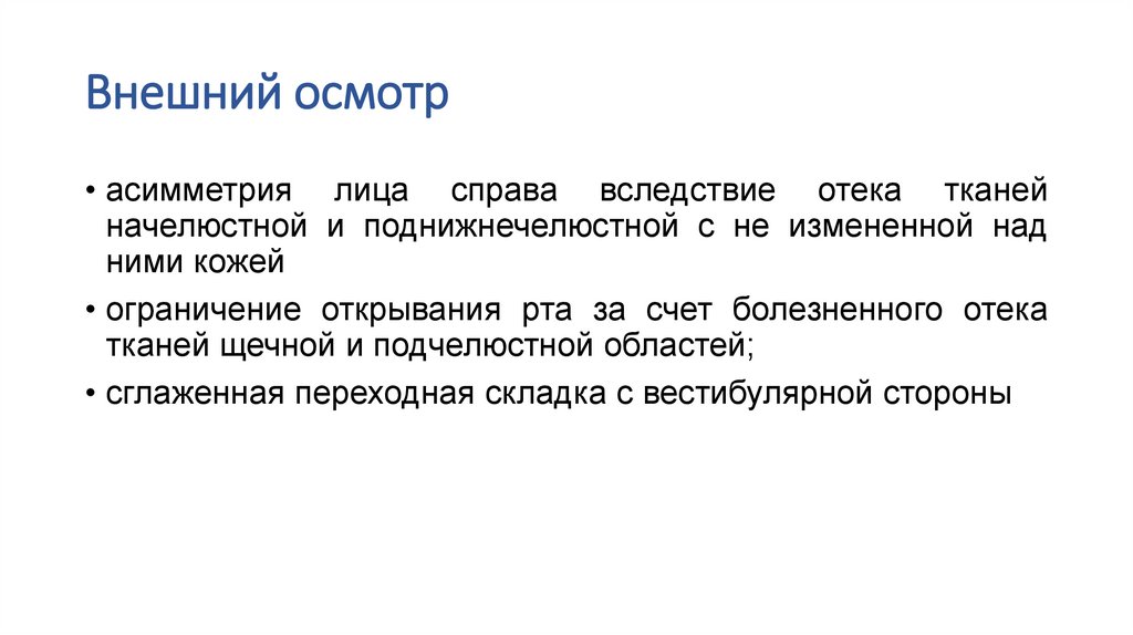 Внешний осмотр• асимметрия лица справа вследствие отека тканей