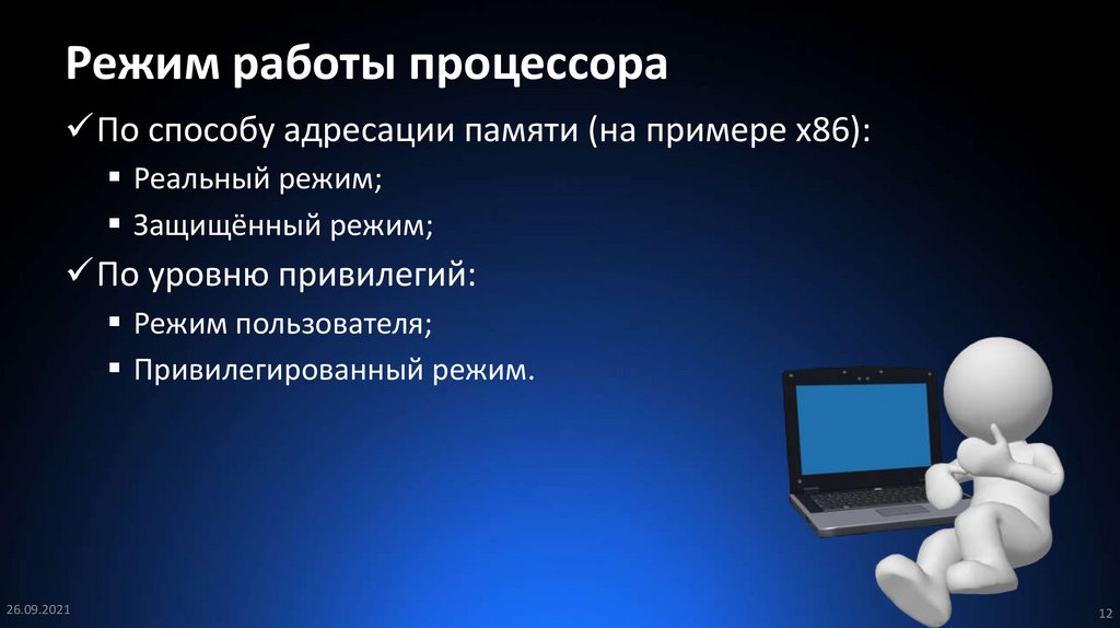 Режим работы процессораПо способу адресации памяти (на примере x86):