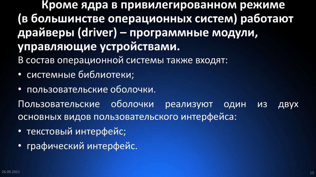 Кроме ядра в привилегированном режиме(в большинстве операционных систем) работают