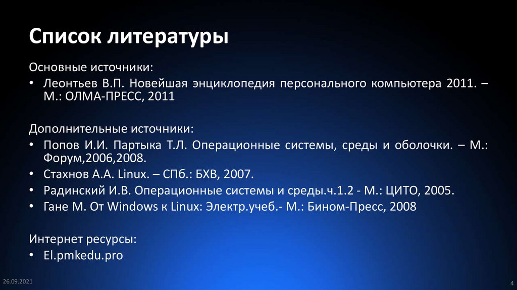 • Попов И.И. Партыка Т.Л. Операционные системы, среды и оболочки. – М.: