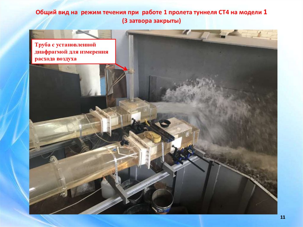 Исследования работы 1 пролета туннеля СТ4 на модели 1 (масштаб 1:40)(открыт затвор №1, затворы № 2-4 – закрыты)