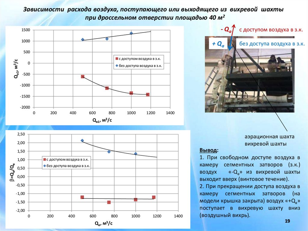 Зависимости расхода воздуха, поступающего на безнапорный участок туннеля СТ4,при дроссельном отверстии площадью 40 м2
