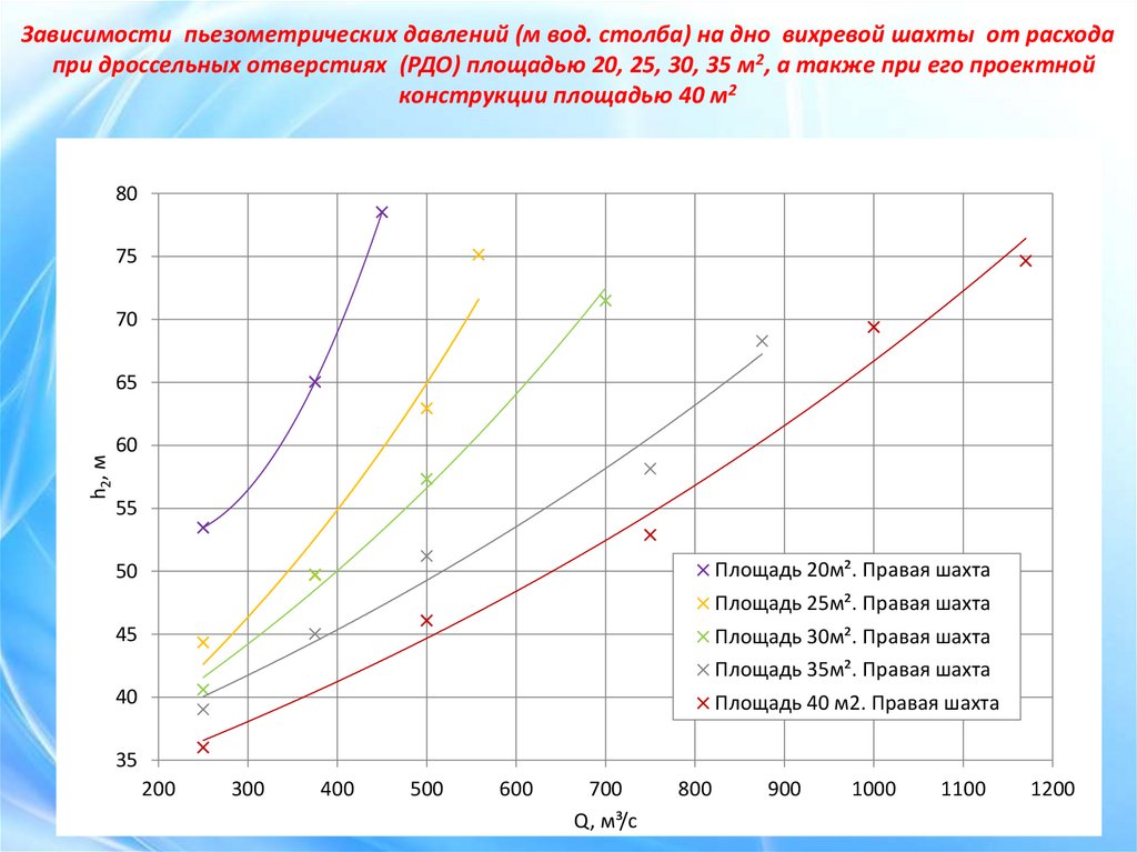 Зависимости пьезометрических давлений (м вод. столба) на дно вихревой шахты от расходаНазвание